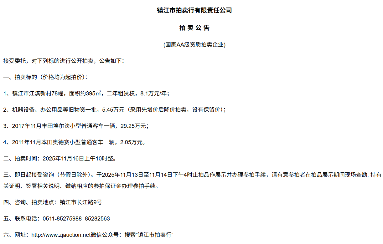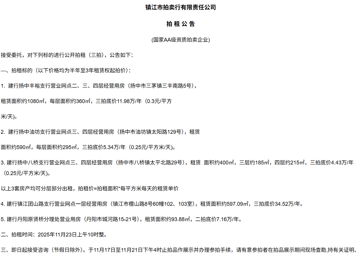 鎮江市拍賣行有限責任公司拍 租 公 吿(國家AA級資質拍賣企業)接受委托,對下列標的進行公開拍租(三拍),公告如下:—、拍租標的(以下價格均為半年至3年租賃權起拍價):1.  建行揚中豐裕支行營業網點二、三、四層經營用房(揚中市三茅鎮三豐南路5號),租賃面積約1080㎡,每層面積約360㎡,三拍底價11.98萬/年(0.3元/平方米/天)。2.  建行揚中油坊支行營業網點三、四層經營用房(揚中市油坊鎮太陽路129號),租賃面積約590㎡,每層面積約295㎡,三拍底價5.34萬/年(0.25元/平方米/天)。3. 建行揚中八橋支行營業網點三、四層經營用房(揚中市八橋鎮太平北路29號),租賃  面積約400㎡,三層約185㎡,四層約215㎡,三拍底價4.43萬/年(0.25元/平方米/天)。以上3套房產均可分層部分出租,拍租價=拍租面積*每平方米每天的租賃單價4. 建行鎮江團山路支行營業網點一層經營用房(鎮江市檀山路8號60幢102、103室),租賃面積約597.09㎡,三拍底價34.52萬/年。5. 建行丹陽原賢橋分理處營業用房(丹陽市城河路15-21號),租賃面積約93.88㎡,二拍底價7.16萬/年。二、拍租時間:2025年11月23日上午10時整。三、即日起接受咨詢(節假日除外)。于11月17日至11月21日下午4時止拍品作展示并辦理參拍手續,請有意參拍者在拍品展示期間現場查勘,持有關證明、簽署相關說明、繳納相應的參拍保證金辦理參拍手續。四、咨詢、拍租地點:鎮江市長江路9號五、聯系方式:0511-85275988   13655299933楊先生六、網址:http://www_zjauction_net.jiudingshipin.com;微信公眾號:搜索“鎮江市拍賣行” 拍品清單2025.11.23序號名稱起拍價(元)標的說明1建行揚中豐裕支行營業網點二、三、四層經營用房(揚中市三茅鎮三豐南路5號),租賃面積約1080㎡,每層面積約360㎡三拍底價11.98萬/年(0.3元/平方米/天)1、1-3號房產均可分層部分出租,拍租價=拍租面積*每平方米每天的租賃單價;2、意向競拍人在拍賣前需持營業執照或身份證與委托方說明租賃房產經營業態,確定意向后出具房產承租用途承諾書,經委托方審核后,方可交納保證金參加競拍;3、租賃期限為半年至3年(承租方與出租方協商而定),承租方每半年或一年結付租金,租賃期間的水、電費用及其它相關費用均由承租方承擔;4、承租方不得用于經營和保管危險物品,不得用于開設餐飲、娛樂等可能嚴重影響消防安全、運營安全的經營業態,不得用于經營委托貸款、小額貸款等可能冒用委托方名義,帶來聲譽風險的經營業態。租賃期內,承租方不得破壞墻體結構,自行成就消防、安全等使用條件,不得擅自將租賃房屋轉租、轉讓給他人使用,否則委托方有權收回房屋;5、拍租成交后,承租方將租金交至出租方指定賬戶,傭金交至拍賣方賬戶(拍租傭金為該房屋一個月租金)。承租方憑租賃合同無息退還保證金。2建行揚中油坊支行營業網點三、四層經營用房(揚中市油坊鎮太陽路129號),租賃面積約590㎡,每層面積約295㎡三拍底價5.34萬/年(0.25元/平方米/天)3建行揚中八橋支行營業網點三、四層經營用房(揚中市八橋鎮太平北路29號),租賃面積約490㎡,每層面積約245㎡三拍底價4.43萬/年(0.25元/平方米/天)4建行鎮江團山路支行營業網點一層經營用房(鎮江市檀山路8號60幢102、103室),建筑面積約597.09㎡三拍底價34.52萬/年5建行丹陽原賢橋分理處營業用房(丹陽市城河路15-21號),建筑面積約93.88㎡二拍底價7.16萬/年